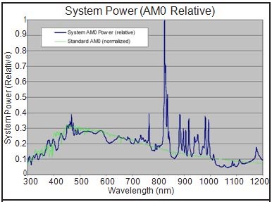 上圖顯示了努美科技/Sciencetech全反射太陽能模擬器的典型輸出光譜。這些光譜輻照度曲線結(jié)合了氙弧燈光源,空氣質(zhì)量過濾器和太陽模擬器光束均化器內(nèi)部使用的反射鏡的光譜曲線。