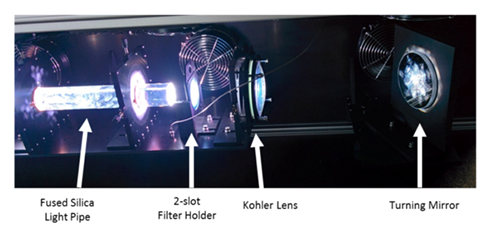 該系統(tǒng)的核心是6500 W氙氣短弧燈和深橢圓形反射鏡,可產(chǎn)生**的光功率并將其重定向到均質(zhì)系統(tǒng)中。使用定制的高度純化的熔融二氧化硅均質(zhì)棒來實(shí)現(xiàn)樣品鼓中所需的空間均勻性。均質(zhì)化的光被引導(dǎo)通過Koehler透鏡配置,被轉(zhuǎn)向鏡折回,然后再次被折回并被準(zhǔn)直鏡導(dǎo)入樣品鼓。其中一個(gè)焦距為3 m的近乎一米直徑的準(zhǔn)直鏡是由一家鏡片供應(yīng)商專門生產(chǎn)的,并經(jīng)過測(cè)試,以確認(rèn)達(dá)到了目標(biāo)輻照度。