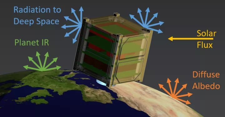 其次,對(duì)于近地軌道上的衛(wèi)星,入射到地球日光側(cè)的太陽(yáng)光通量會(huì)被漫反射到衛(wèi)星朝向地球一側(cè)的表面。這些反射的大小取決于地球的局部表面特性以及不斷變化的大氣條件。總的來(lái)說,漫反射太陽(yáng)光通量大約是直接太陽(yáng)光通量的三分之一,被稱為反照率通量。當(dāng)衛(wèi)星進(jìn)入日食時(shí),這些直接的太陽(yáng)光通量和反照率載荷下降為零,但有一個(gè)第三環(huán)境熱源始終存在。地球是溫暖的,相當(dāng)于一個(gè)漫射器,其紅外輻射的大小是緯度和經(jīng)度的函數(shù)。知道這些隨時(shí)間變化的環(huán)境通量,以及它們?cè)谛l(wèi)星表面的分布,是計(jì)算衛(wèi)星溫度所需要的輸入,這涉及到求解固體部分的熱傳導(dǎo)和所有暴露表面的輻射。通常將這些環(huán)境通量分為兩個(gè)波段:太陽(yáng)波段和環(huán)境波段。
