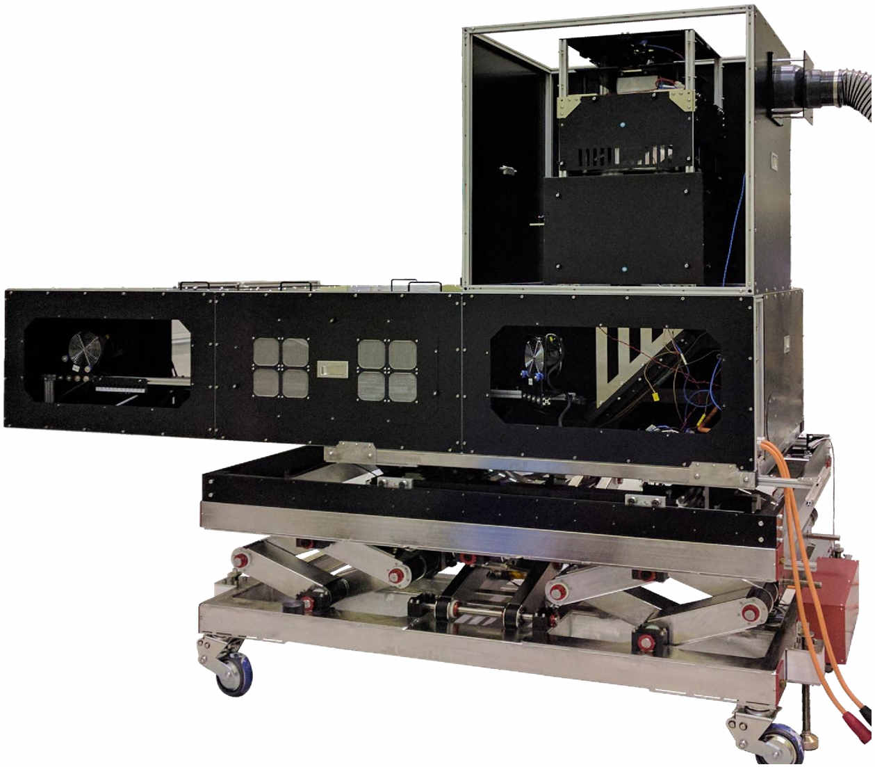 我們的客戶需要整個太陽能模擬器在5個軸(X,Y和Z)以及2個旋轉(zhuǎn)軸上進(jìn)行自動運(yùn)動。此外,整個系統(tǒng)需要在無塵室內(nèi)運(yùn)行,因此必須隔離太陽能模擬器的空氣冷卻系統(tǒng)。