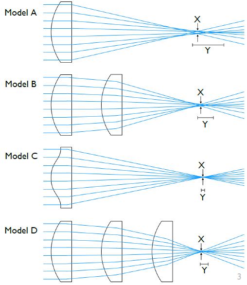 A型-單平凸球面透鏡:**簡單,成本**低的選擇,但聚焦時光斑尺寸**,而準直時光斑質量**差。